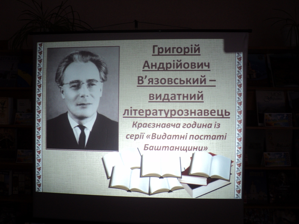Під такою назвою 3 лютого в Баштанській центральній районній бібліотеці пройшла краєзнавча година, присвячена 96-й річниці від дня народження Г. А. В’язовського - нашого земляка, літературознавця, критика, поета, уродженця с. Полтавка Херсонської губернії (нині м. Баштанка Миколаївської обл.) Цей захід є одним із серії краєзнавчих годин «Видатні постаті Баштанщини», присвячених нашим землякам, які своїм життям, працею, творчістю принесли славу рідній землі і Батьківщині. Дуже шкода, що інформація про декого з них довгий час замовчувалась.