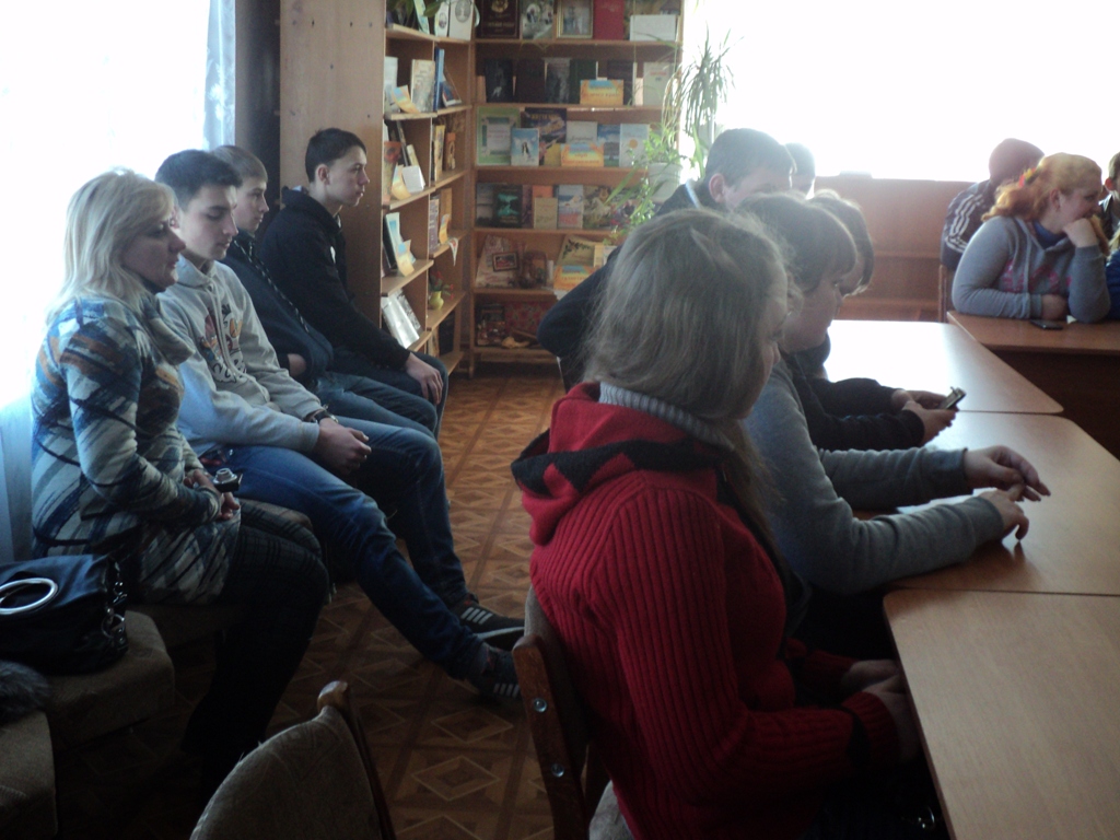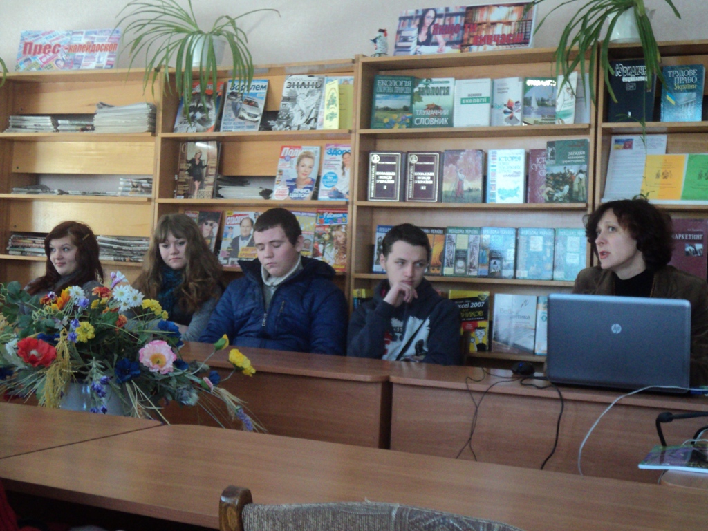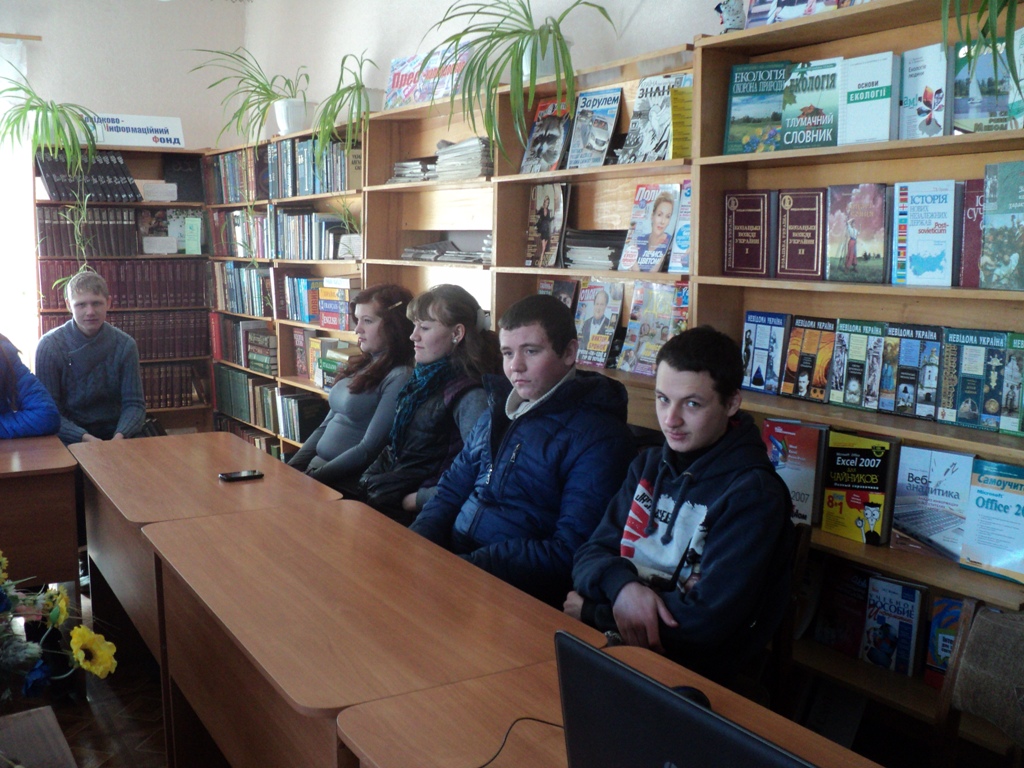 18 лютого в центральній районній бібліотеці відбувся інформаційний тренінг«СНІД: подумай про майбутнє - обери життя» за участі Л.О.Смоли, директора районного центру соціальних служб для сім’ї, дітей та молоді. Захід проходив в рамках бібліотечної програми «Здорова нація – сильна держава». На західдо бібліотеки були запрошені учні професійного ліцею разом з бібліотекарем Н.І.Андреєвою.