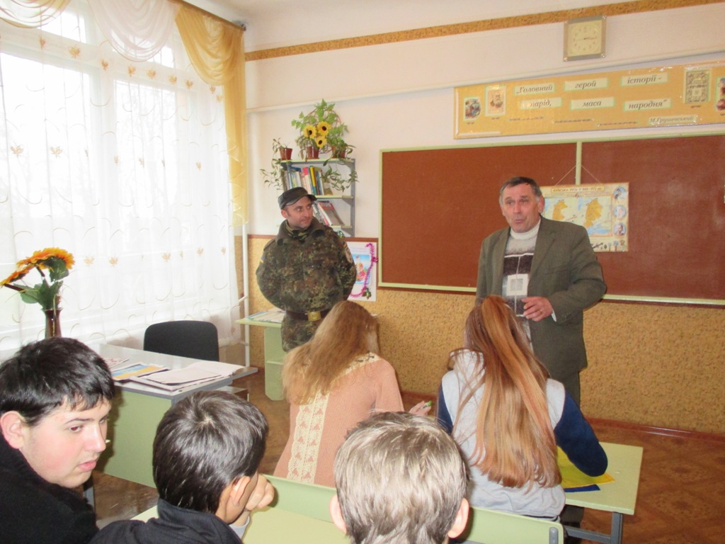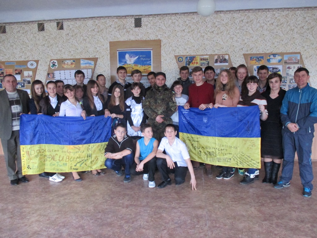 По закінченню лінійки учні старших класів та учителі мали змогу поспілкуватися з Сагайдаком Сергієм. Саме головне, на що звернув увагу Сергій – це виховання патріота України, любов до своєї рідної України. Велика любов починається з маленької любові до свого села, родини, школи.