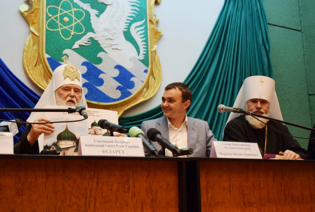 Під час спільної прес-конференції з Патріархом Київським і всієї Руси-України Святійшим Філаретом голова облдержадміністрації Вадим Меріков презентував проект нової церкви в Жовтневому районі.