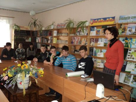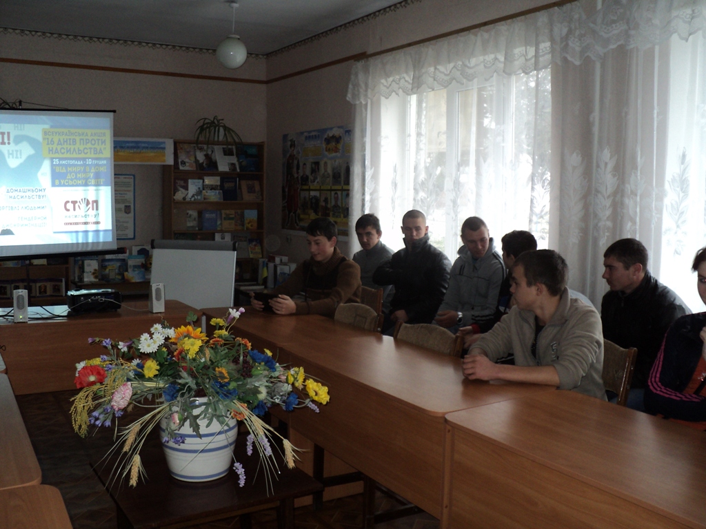 На початку заходу завідуюча відділом обслуговування Ірина Георгіївна Озерова розповіла учням про історію започаткування в Україніакції «16 днів проти насильства» та проважливі дати, які охоплює її шістнадцятиденний період.