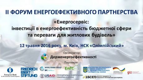 З метою стимулювання практичного впровадження механізму енергосервісу в бюджетній сфері Агентство проводить II масштабний Форум енергоефективного партнерства «Енергосервіс: інвестиції в енергоефективність бюджетної сфери та переваги для житлових будівель». Захід відбудеться 12 травня 2016 року у м. Києві.