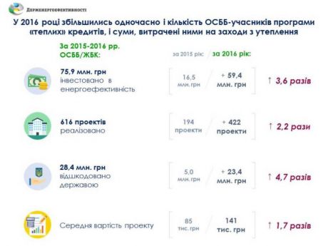 «Цьогоріч одночасно у 2-3 рази збільшилась і кількість ОСББ, які звернулися за Урядовою допомогою на утеплення житла, і суми коштів, залучених ними на енергомодернізацію. Так, якщо у 2015 році реалізовано 194 проекти з підвищення енергоефективності багатоквартирних будинків, то у 2016 році вже у 2,2 рази більше – 422 проекти. У 2015 році на ці цілі ОСББ залучили 16,5 млн грн. кредитних коштів, а в 2016 році у 3,6 разів більше – 59,4 млн гривень. Загалом, за два роки в утеплення багатоповерхівок інвестовано 75,9 млн грн коштів ОСББ-учасників програми», – повідомив Голова Держенергоефективності Сергій Савчук та додав, що держава, зі свого боку, за 2015-2016 рік відшкодувала цим ОСББ 28,4 млн гривень.
