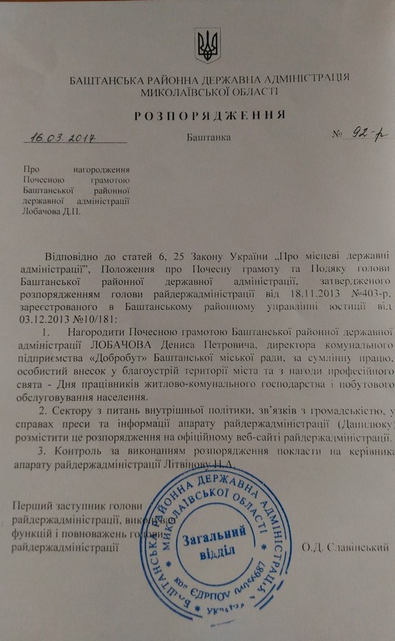 Розпорядженням голови райдержадміністрації від 16.03.2017 №92-р "Про нагородження Почесною грамотою Баштанської районної державної адміністрації Лобачова Д.П." нагороджено Почесною грамотою райдержадміністрації Лобачова Дениса Петровича, директора комунального підприємства "Добробут" Баштанської міської ради, за сумлінну працю, особистий внесок у благоустрій міста та з нагоди професійного свята - Дня працівників житлово-комунального господарства і побутового обслуговування населення.