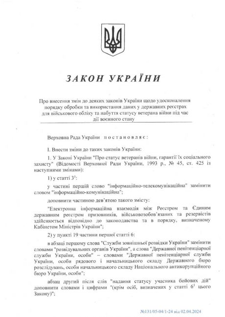 Верховною Радою України прийнято Закон України від 16 січня 2024 року № 3549-IX "Про внесення змін до деяких законів України щодо удосконалення порядку обробки та використання даних у державних реєстрах для військового обліку та набуття статусу ветерана війни під час дії воєнного стану", який набирає чинності з дня, наступного за днем його опублікування.