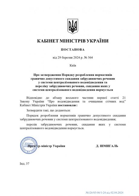 Кабінетом Міністрів України прийнято постанову від 29 березня 2024 року № 364 "Про затвердження Порядку розроблення нормативів гранично допустимого скидання забруднюючих речовину системі централізованого водовідведення та переліку забруднюючих речовин, скидання яких у системи централізованого водовідведення нормується"