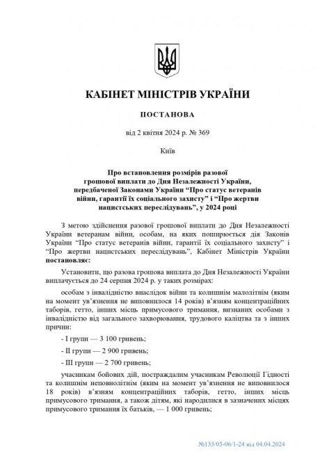 Кабінетом Міністрів України прийнято постанову від 02 квітня 2024 року № 369 "Про встановлення розмірів грошової виплати до Дня Незалежності України, передбаченої Законами України "Про статус ветеранів війни, гарантії їх соціального захисту" і "Про жертви нацистських переслідувань", у 2024 році"