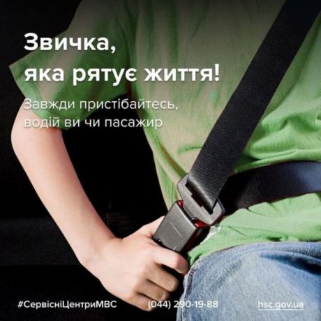 Тиждень Безпеки Дорожнього Руху Головний сервісний центр МВС нагадує: навіть якщо ви страшенно поспішаєте, нервуєте, вважаєте пасок неефективним та незручним тощо надійно пристебнутий ремінь безпеки міцно утримує людину на сидінні та у випадку автопригоди перешкоджає зіткненню з твердими елементами салону.