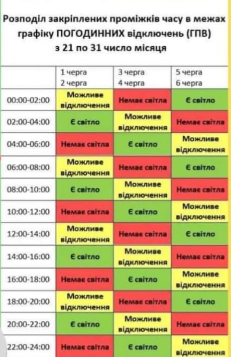 Нагадуємо, що від сьогодні діє новий графік погодинних відключень (ГПВ) для третьої декади місяця!