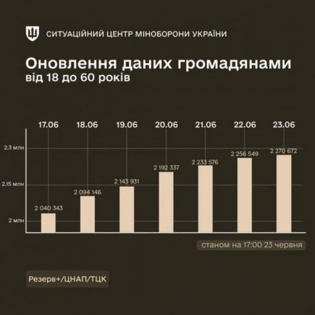За інформацією Ситуаційного центру Міністерства оборони України, за тиждень (з 17 по 23 червня) облікові дані через застосунок Резерв+, ТЦК або ЦНАП оновили понад 230 329 громадян.