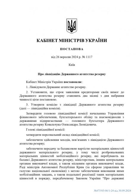 Кабінетом Міністрів України прийнято постанову від 26 вересня 2024 року № 1117 "Про ліквідацію Державного агентства резерву"