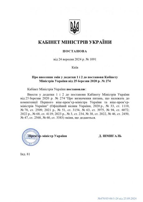 Кабінетом Міністрів України прийнято постанову від 24 вересня 2024 року № 1091 "Про внесення змін у додатки 1 і 2 до постанови Кабінету Міністрів України від 25 березня 2020 р. № 274"
