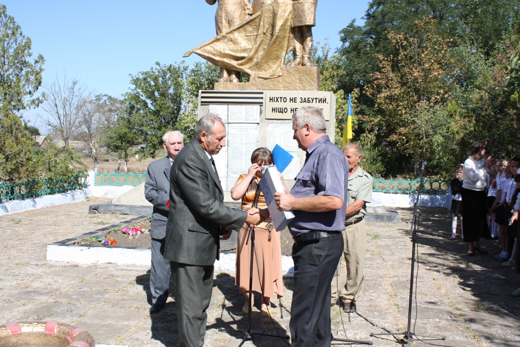 19 вересня відбулася передача районної естафети «Пам’ять» у селі Плющівка Баштанського району. У заході взяли участь керіник апарату райдержадміністрації Ніна Літвінова, заступник голови районної ради Валентина Єланцева, голова районної ветеранської організації Лідія Андрєєва.