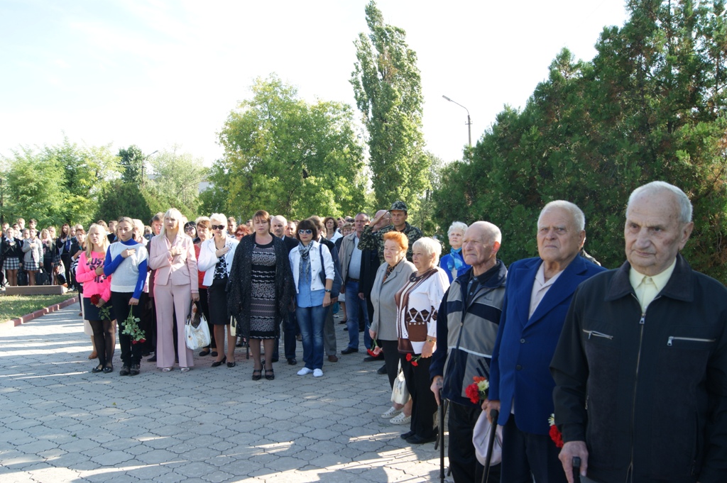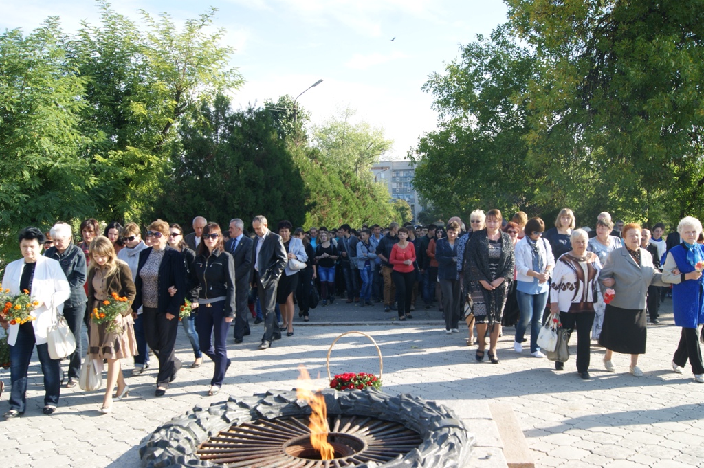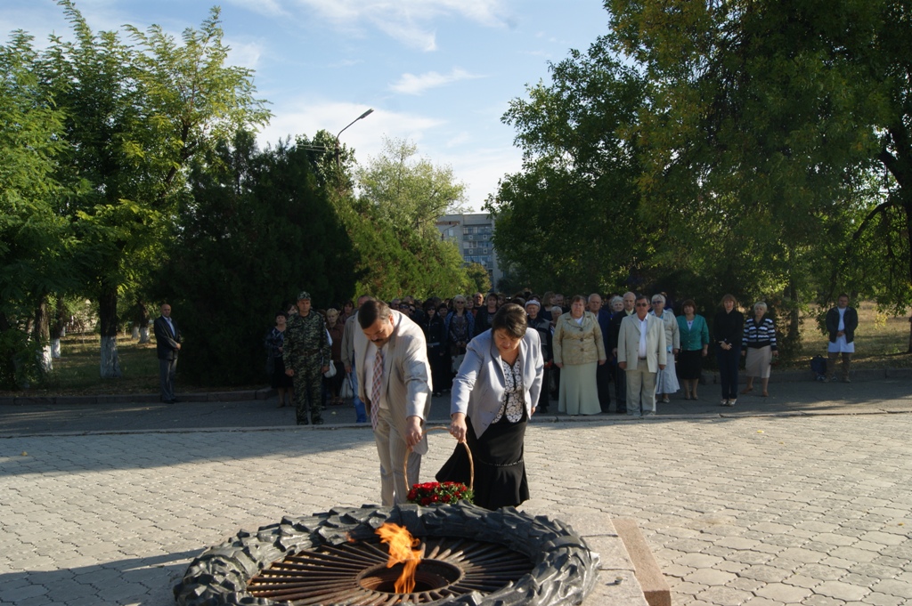 Керівники району та міста поклали квіти до Вічного Вогню та обелісків на Пагорбі Слави, вшанували загиблих героїв у часи Великої Вітчизняної війни, Революції гідності та Антитерористичної операції на сході країни хвилиною мовчання.