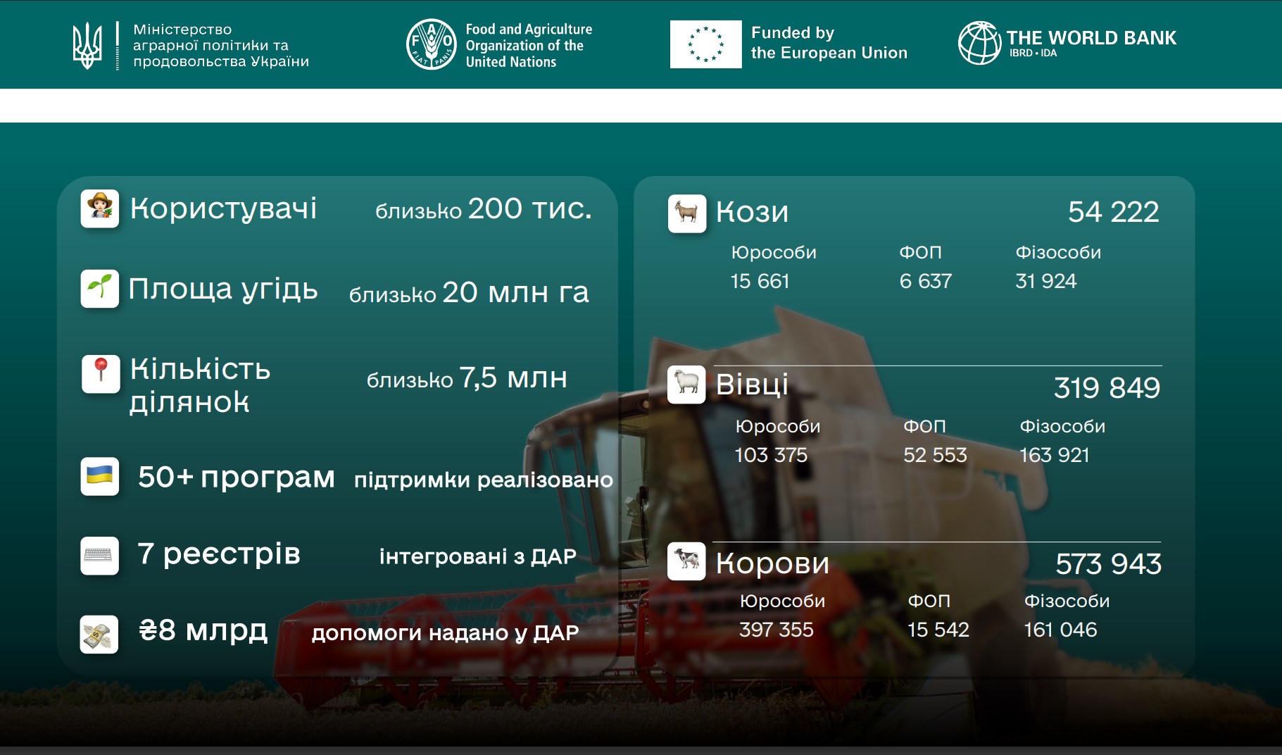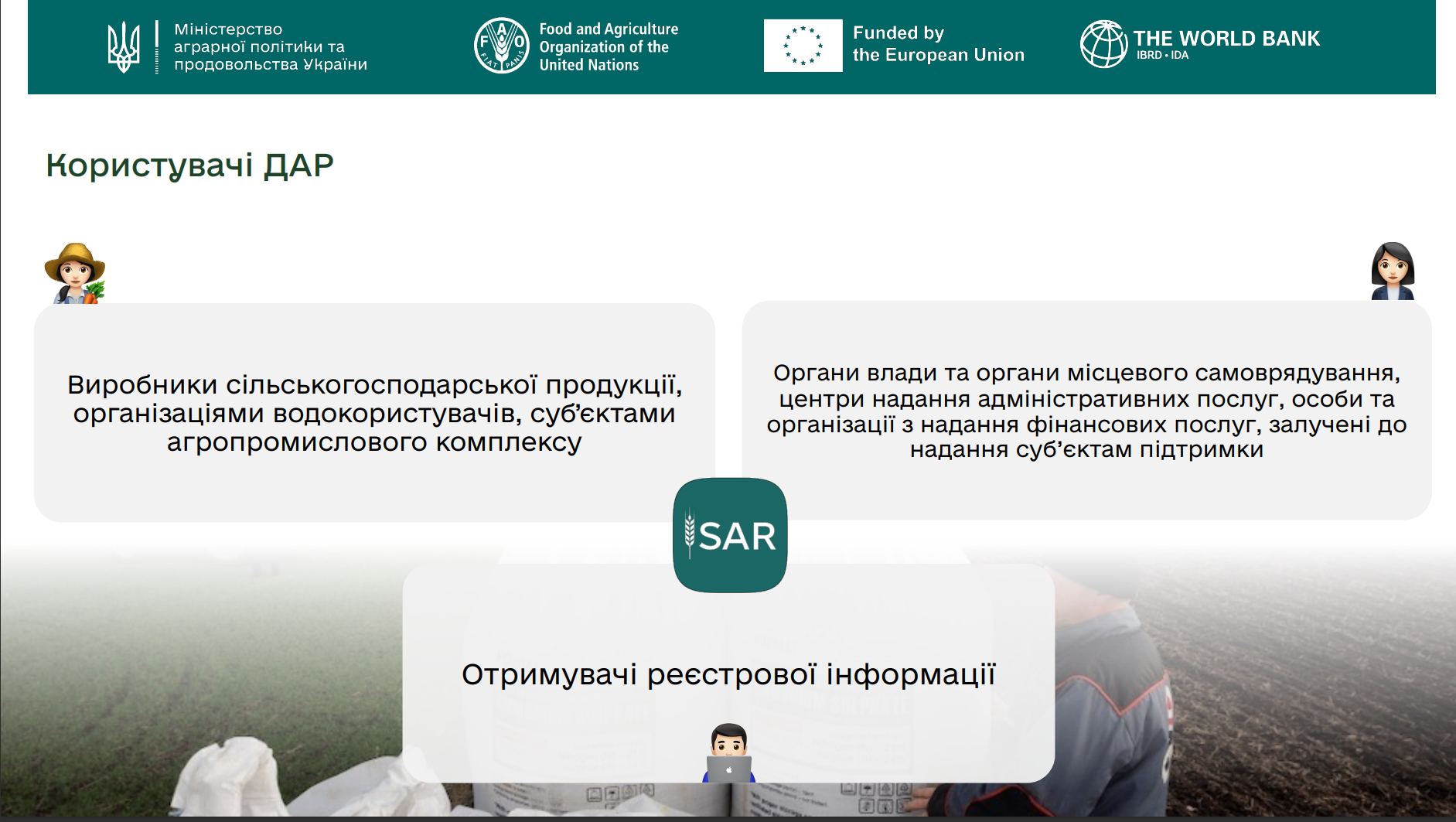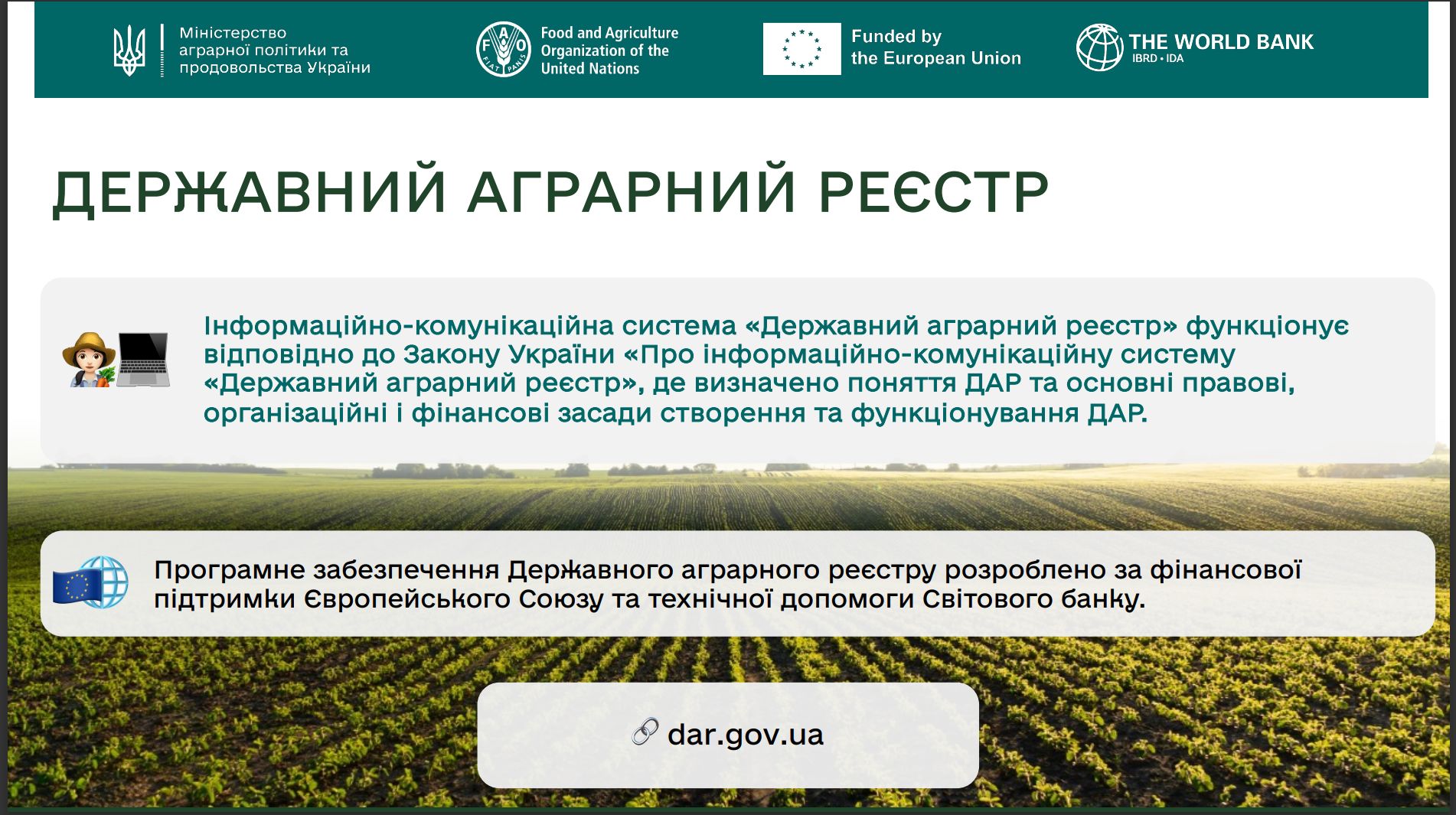 Інформаційно-комунікаційна система «Державний аграрний реєстр» (ДАР) є офіційним онлайн-інструментом державної підтримки агровиробників. Платформа функціонує відповідно до Закону України «Про інформаційно-комунікаційну систему «Державний аграрний реєстр» і забезпечує: облік, зберігання, обробку та захист реєстрових даних; електронний обмін інформацією; надання адміністративних та інших публічних послуг суб’єктам аграрної діяльності; підтримку реалізації аграрної політики та продовольчої безпеки держави.