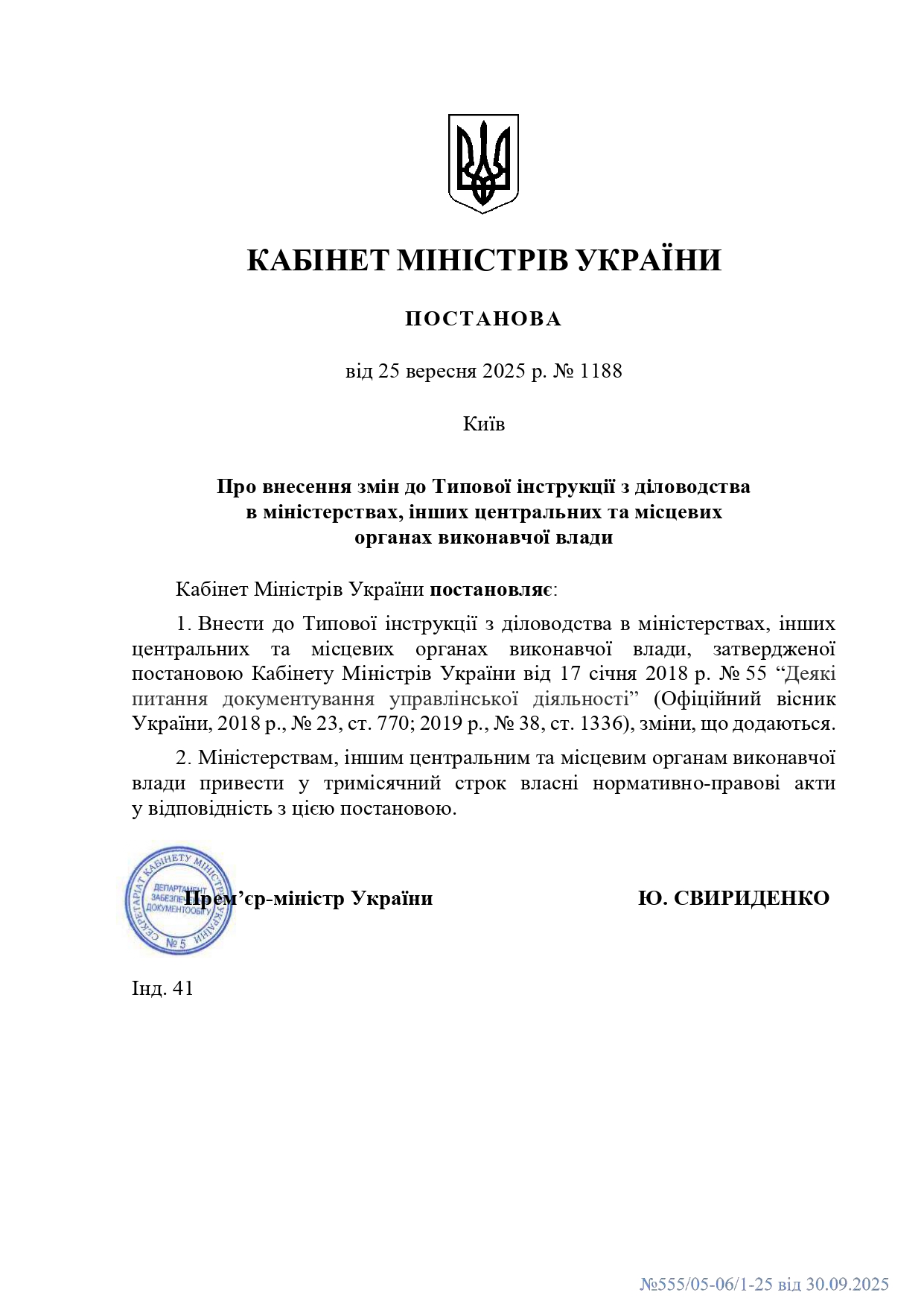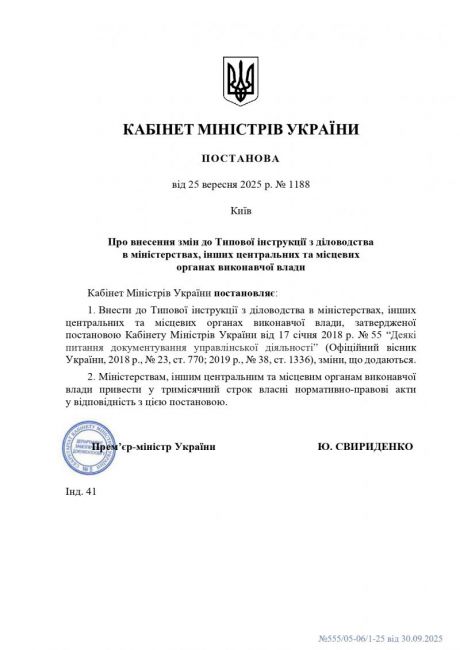 Кабінетом Міністрів України затверджено постанову від 25 вересня 2025 року № 1188 "Про внесення змін до Типової інструкції з діловодства в міністерствах, інших центральних та місцевих органах виконавчої влади”.