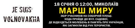 Всіх небайдужих громадян запрошують о 12:00 годині прийти на Миколаївський Майдан (головна площа міста) та ходою пройти до вулиці Садової, 12. Саме там біля Кафедрального собору Касперівської ікони Божої Матері відбудеться Молебень в пам'ять про українців, які загинули у Волновасі. Учасників просять брати з собою плакати з написами «Я – Волноваха», прапори, українську символіку та лампадки. В Марші миру візьмуть участь керівники області та міста, військовослужбовці, волонтери, депутати, представники політичних партій та громадських організацій, громадські активісти.