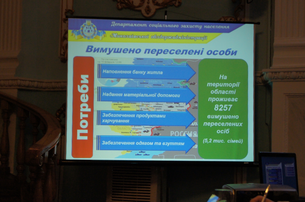 Спілкуючись з журналістами, Оксана Янішевська розповіла, що до Миколаївської області прибуло майже 8,3 тисячі вимушених переселенців. «Всі ці люди зареєстровані та отримали відповідну довідку, яка дає можливість отримувати компенсаційні виплати. У нас вже є категорія громадян, які впродовж 3 місяців не знайшли роботу, і їхні виплати, згідно Постанови Кабміну, знизяться вдвічі. Також до нас прибувають люди, які раніше не проживали на території, яка сьогодні визначена, як зона проведення АТО, а мешкали поблизу цієї зони, вони не отримують цих виплат, але також потребують уваги та допомоги. Перш за все, це розміщення. Для такої кількості людей знайти комфортне житло дуже складно, тому ми майже щоденно звертаємося по допомогу з проханням надати інформацію про вільне житло, або прийняти до себе переміщених людей. Така інформація надходить, це приблизно в середньому 30 дзвінків на день з пропозицією прийняти людей. Всі ці пропозиції зважуються: обов’язково перевіряється технічне оснащення та придатність для проживання в такому приміщенні. Якщо ми пропонуємо людям житло, то ми повинні знати, що людям можна буде заселитися. Оскільки більшість переміщених це жінки та діти, ми піклуємося про те, щоб надавати житло, придатне для проживання».