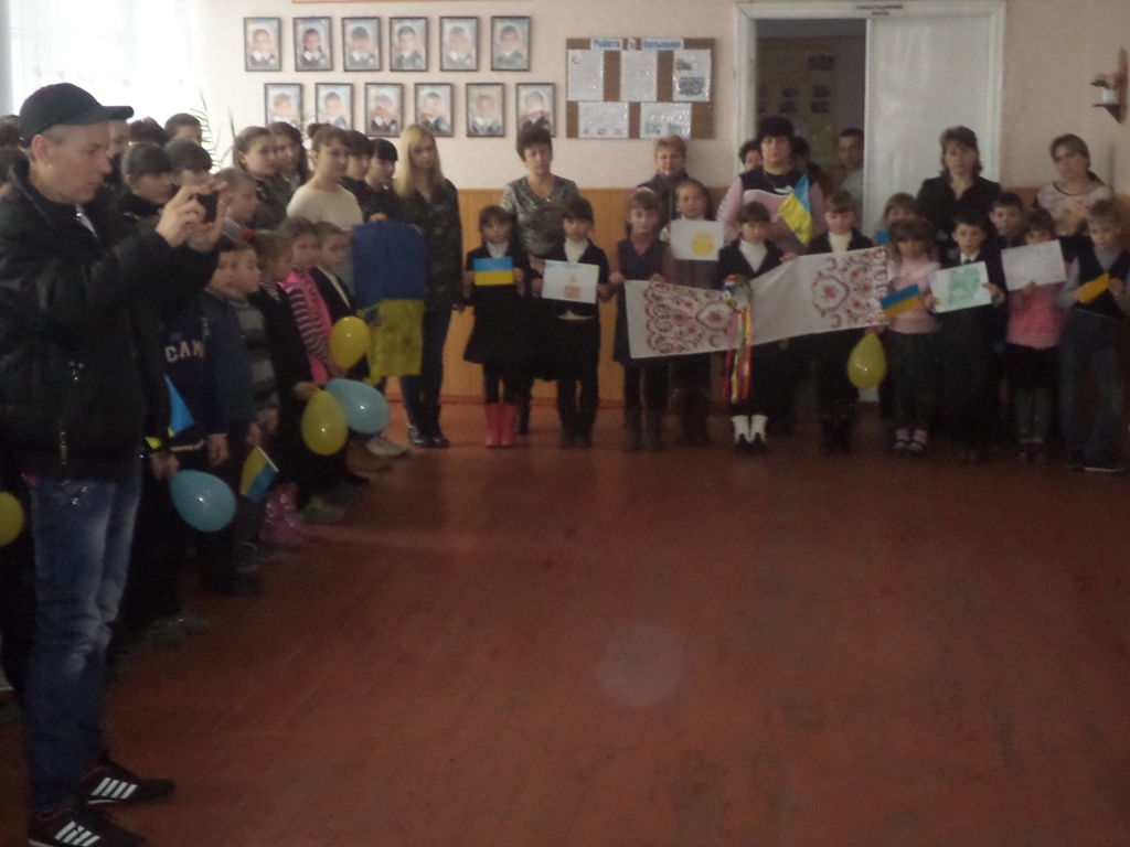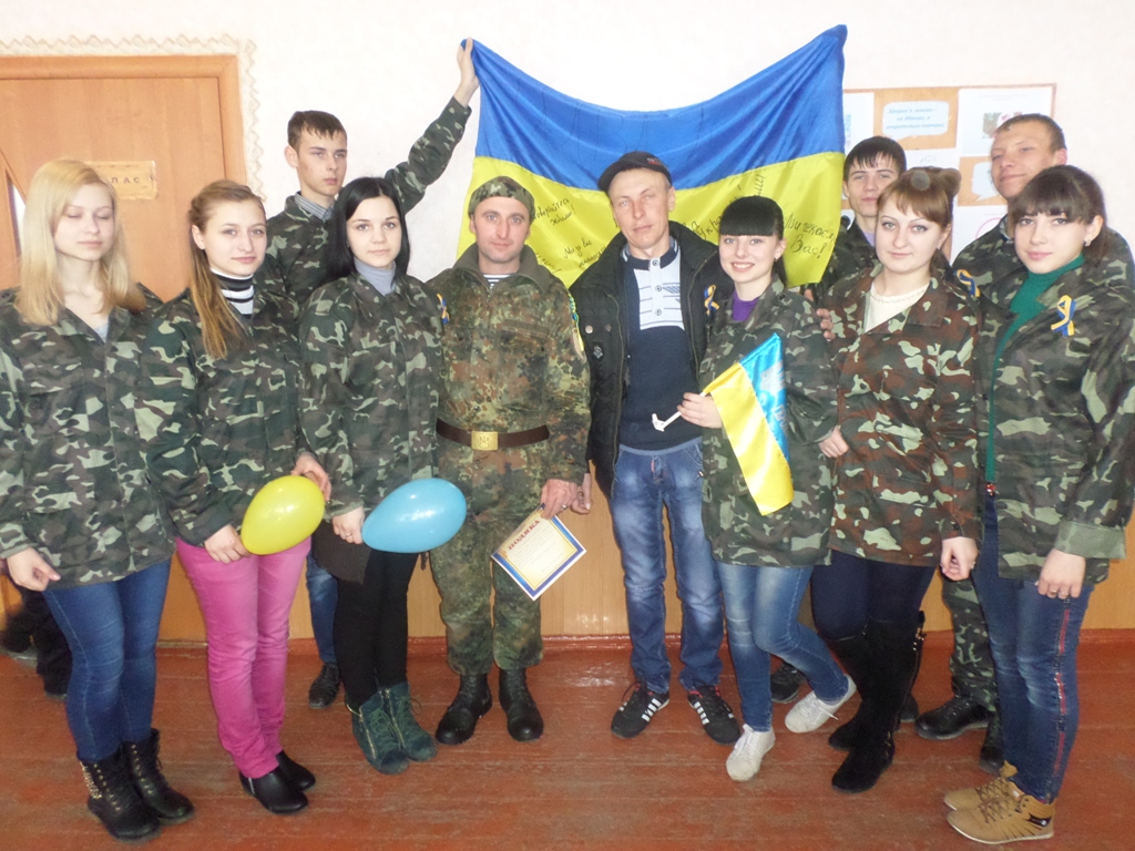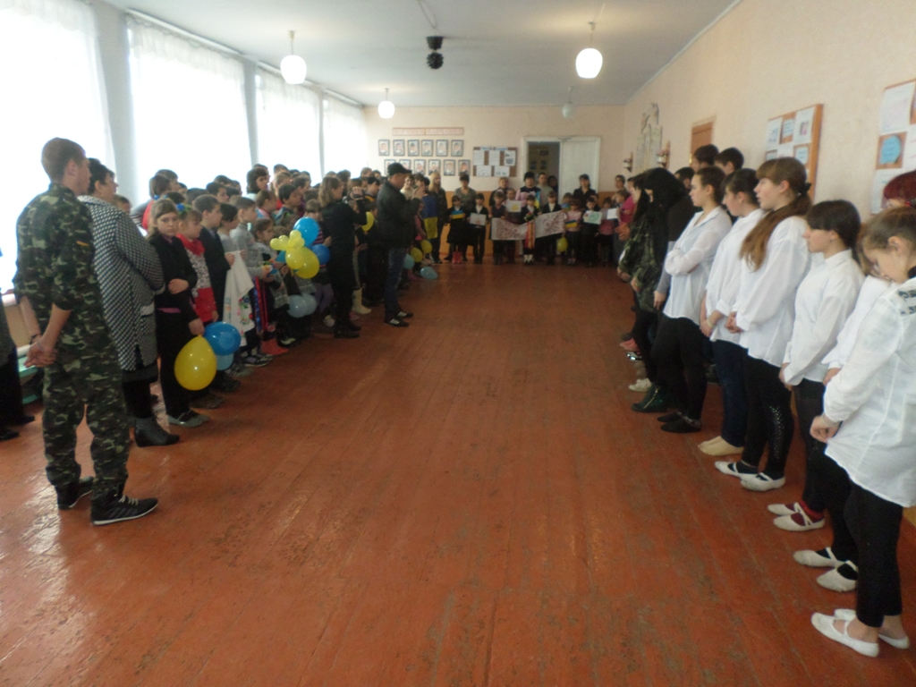 У своєму виступі волонтер Сергій Сагайдак розповів присутнім про те, що він власними очима бачив будні наших захисників в умовах війни, самому неодноразово доводилося перебувати під обстрілом під час доставки продуктів харчування, одягу, комп’ютерної техніки в зону АТО, а також приймати участь в евакуації поранених. Він зустрічався на передовій з бійцями під Дебальцево, з 28 бригади 3 батальйону, із земляками з 79-ої аеромобільної бригади, тощо.  Наголосив на тому, що наша допомога фронту вкрай необхідна, її чекають, а тому він прикладає максимум зусиль, щоб зібрати і доставити гуманітарну допомогу туди, де вона найнеобхідніша. Відмітив і те, що бійці дуже вдячні дітям за їхні листи і малюнки, обереги, тому що в більшості  воїнів  вдома чекають діти , мир для яких вони відстоюють, а від таких подарунків  віє теплом, рідною домівкою і впевненістю, що вони діють правильно, відстоюючи неподільність України.