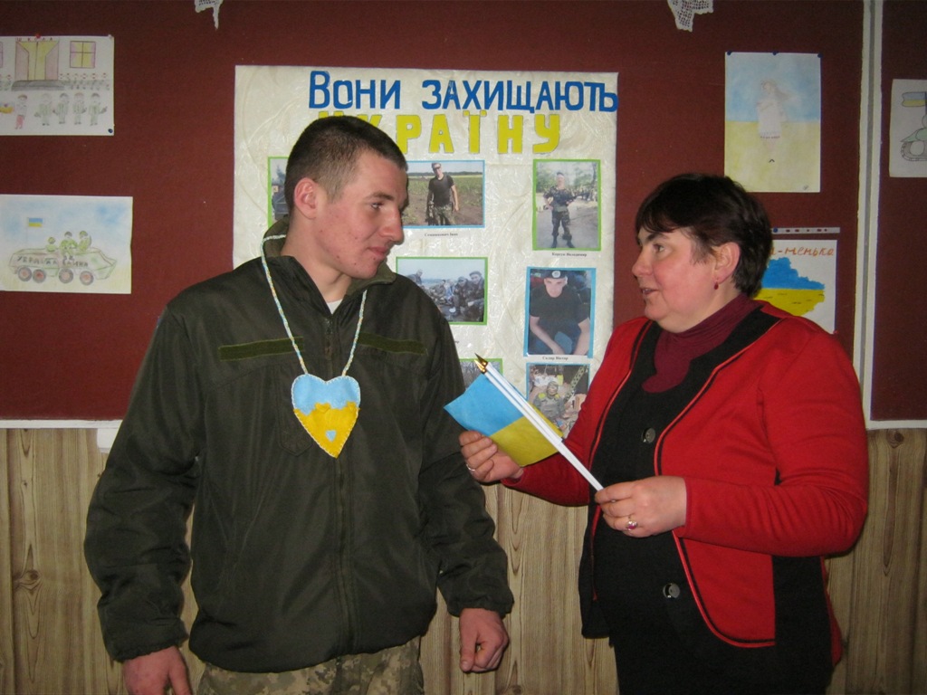 Учні написали свої побажання на маленьких українських прапорцях, які Данило пообіцяв взяти із собою в АТО і показати друзям. Діти вручили також подарунки.