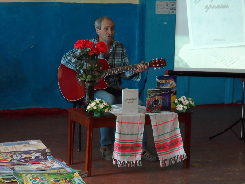 Продовжуючи роботу «Бібліомаршрутки», завідуюча відділом обслуговування центральної районної бібліотеки І.Г. Озерова презентувала слухачам нову збірку поезій В.Коваленка «Зачарований промінь» та запропонувала переглянути буктрейлер на це видання, який створила бібліотека. Учасники зустрічі з цікавістю переглянули відеоролик та оплесками зустріли самого автора. Віктор Георгійович розповів про свою творчість, про нову збірку, читав свої поезії. А срібні струни його гітари зачарували і захопили залу пісенному вирі.В приміщенні старенького клубу лунали ліричні, патріотичні твори автора, які із задоволенням підтримували присутні. Вдячні прихильники творчості поета-пісняра подарували йому прекрасні  квіти.