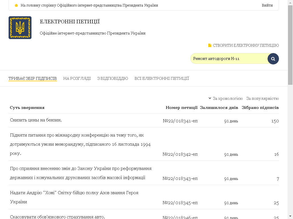 3. Знаходите петицію щодо ремонту автодороги Н-11 за номером  №22/017299-еп. або ввести у пошуку "Ремонт автодороги Н-11".
