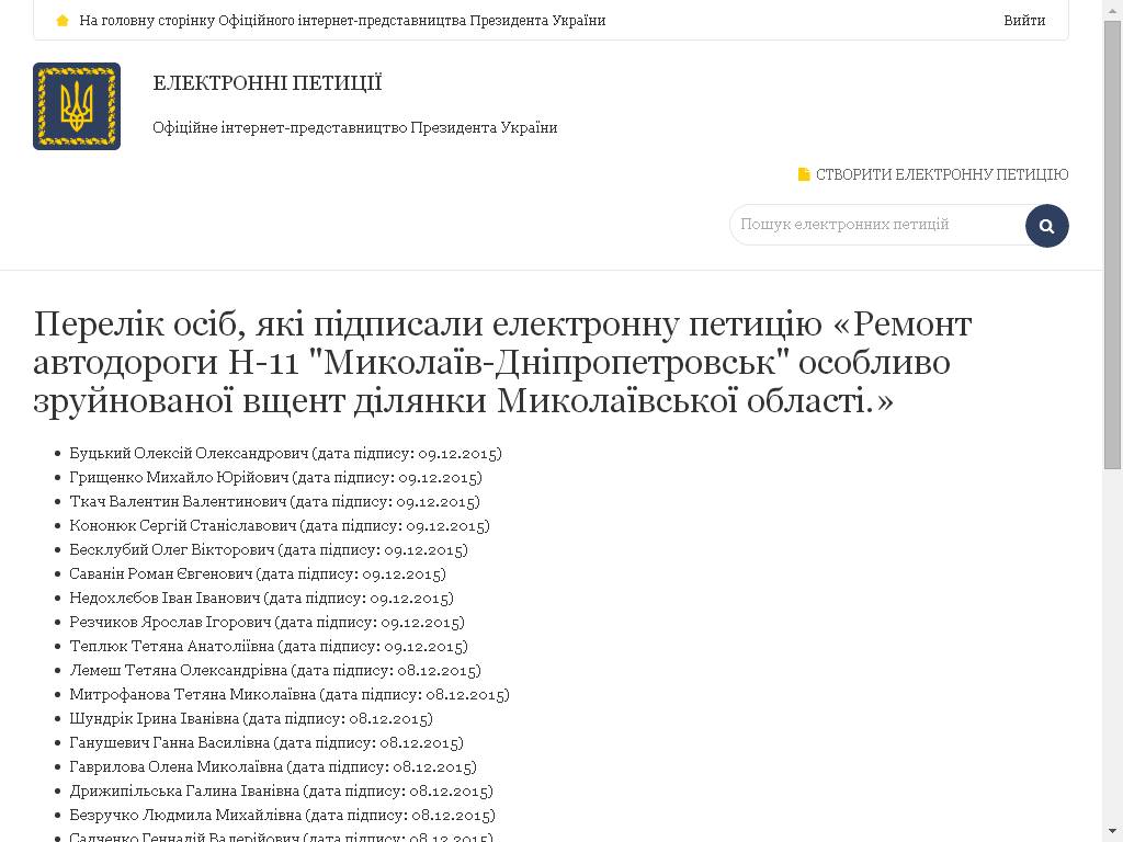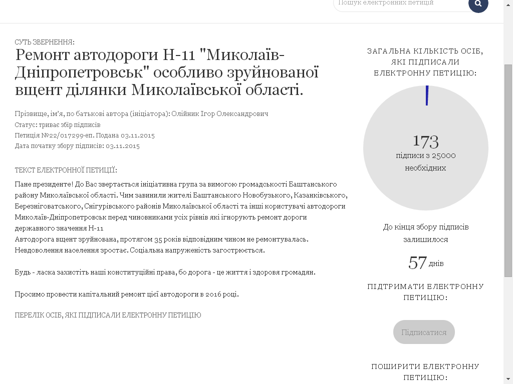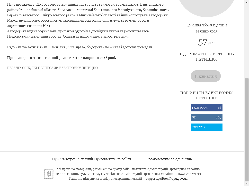 На сайті Президента України в розділі електронні петиції створено петицію №22/017299-еп стосовно зазначеної проблеми - ремонту автодороги Н-11, зареєстровану ініціативною групою Баштанщини.