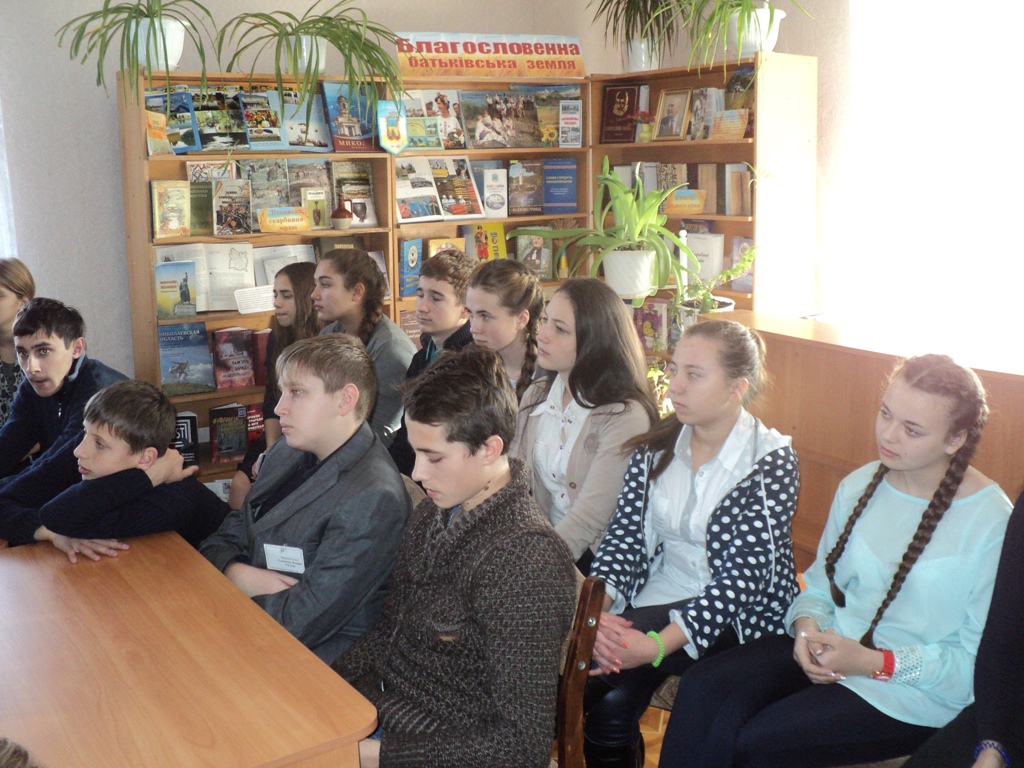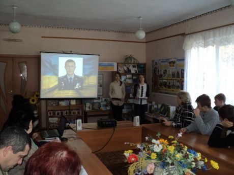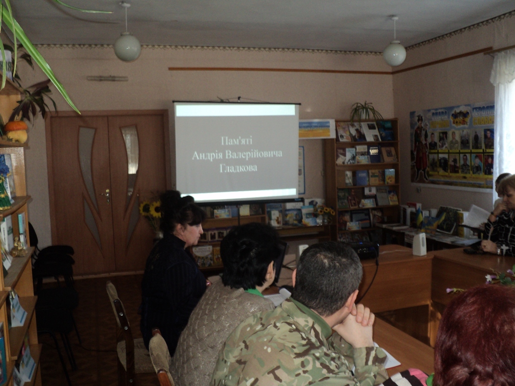 Після перегляду своїми світлими спогадами про колишнього учня з присутніми поділилася І.О.Малярчук – класний керівник Андрія Гладкова. Не приховуючи хвилювання, звернувся до молодого покоління учасник АТО Віктор Чернов, який закликав берегти свою рідну землю, її святині та пам’ятати своїх Героїв. Від імені всіх присутніх директор ЦБС Г.І.Борщевецька висловила Віктору Анатолійовичу глибоку вдячність за мужність, відвагу і побажала всім мирного майбутнього. Вона також запропонувала передати відео про героя-земляка А. Гладкова до районного краєзнавчого музею, щоб пам'ять про мужнього земляка зберігалась і для майбутніх поколінь.