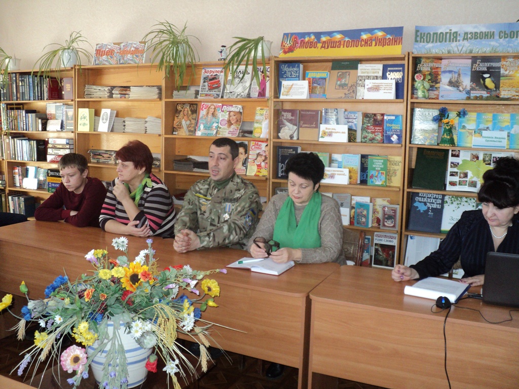 Учасники зустрічі з цікавістю прослухали розповідь ведучої І.Г.Озерової про героїчну історію Збройних сил України, які пройшли непростий шлях становлення. За плечима військових Збройних Сил славні традиції предків, великі звитяги козацтва, подвиги батьків, дідів в роки другої світової війни, героїчні сторінки неоголошеної Афганської війни. У нинішній непростий час, коли наша держава перебуває у серйозному збройному конфлікті, на Сході України йдуть військові дії, точаться криваві бої. Там вирішується доля і майбутнє України. Сили АТО намагаються протистояти терористам. На полі битви – захисники, воїни. Вони мужні, завзяті, незламні та готові власним життям боронити мир та спокій рідної держави. Серед них був і наш земляк – кадровий військовий, майор Андрій Валерійович Гладков. 29 серпня 2014 року під час виходу «Коридором смерті» під Іловайськом майор Андрій Гладков загинув, як Герой, за єдність та суверенітет рідної країни.