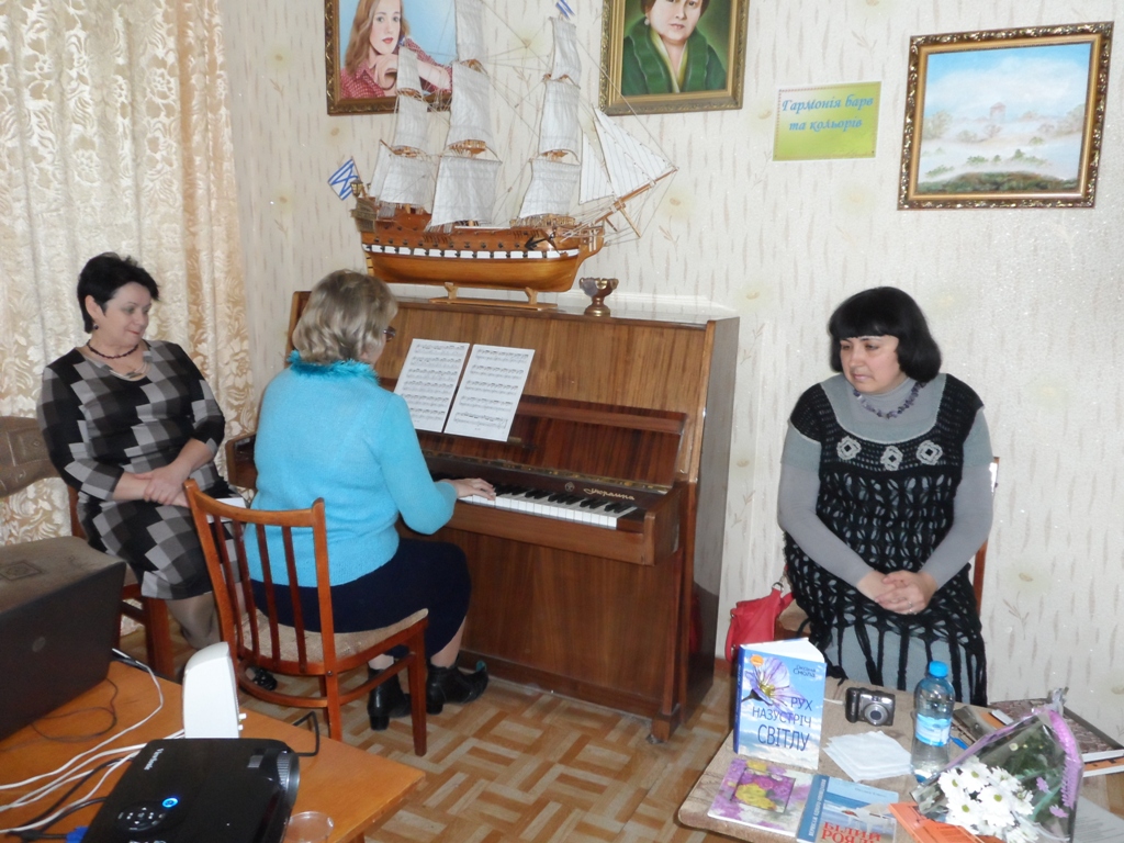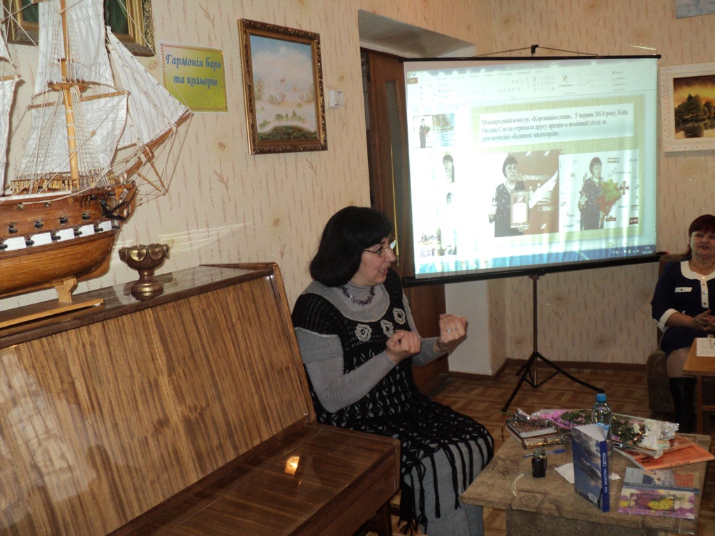 Розповідь ведучої супроводжувалась мультимедійною презентацією. Учасники засідання також переглянули буктрейлери на книги Оксани Смолии «Рух назустріч Світлу» та «Білий рояль», які було підготовлено бібліотечними працівниками на конкурс «Читаємо, вивчаємо, шануємо свій рідний край».