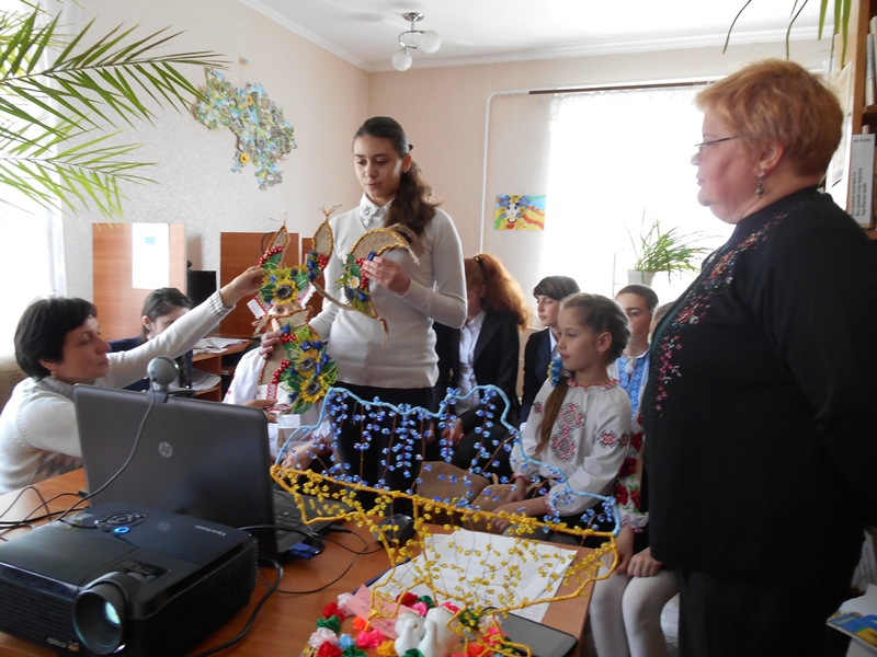 Он-лайн зв’язок забезпечив живе і щире спілкування. Нашим гостям було цікаво почути і побачити як фото, так і самі поробки, які принесли на цю зустріч учасниці гуртка декоративно-ужиткового мистецтва Будинку дитячої та юнацької творчості - учениці: 7-Б класу Сук Євгенія та 8-Б Наталочкіна Юлія. Євгенія розповіла про свою роботу «Оберіг», яку виконано в техніці «тканина і нитяна пластика». Цю роботу авторка вважає символом нашого степового краю. Юля продемонструвала чудову роботу, в якій були використані споконвічнінародні обереги: ляльки –мотанки: нерозлучники, багаторучки та ін.
