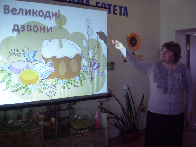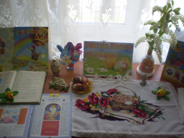 Свято Воскресіння Господнього святкують християни в усьому світі, проте у кожній країні є своєрідні усталені звичаї і традиції. Учням запропонували розглянути їх на прикладі країн Європи та США і Канади. За допомогою мультимедійної презентації діти здійснили віртуальну екскурсію музеєм «Писанка» у м. Коломия Івано-Франківської області, ознайомилися з пам’ятниками писанці в Україні та з найбільшим у світі пам’ятником, який знаходиться у канадському місті Вегревіль. Увагу дітей привернула книжкова виставка «Світла Пасха на порозі», де поряд з книгами можна було побачити пасхальні вироби, зроблені руками бібліотекарів.
