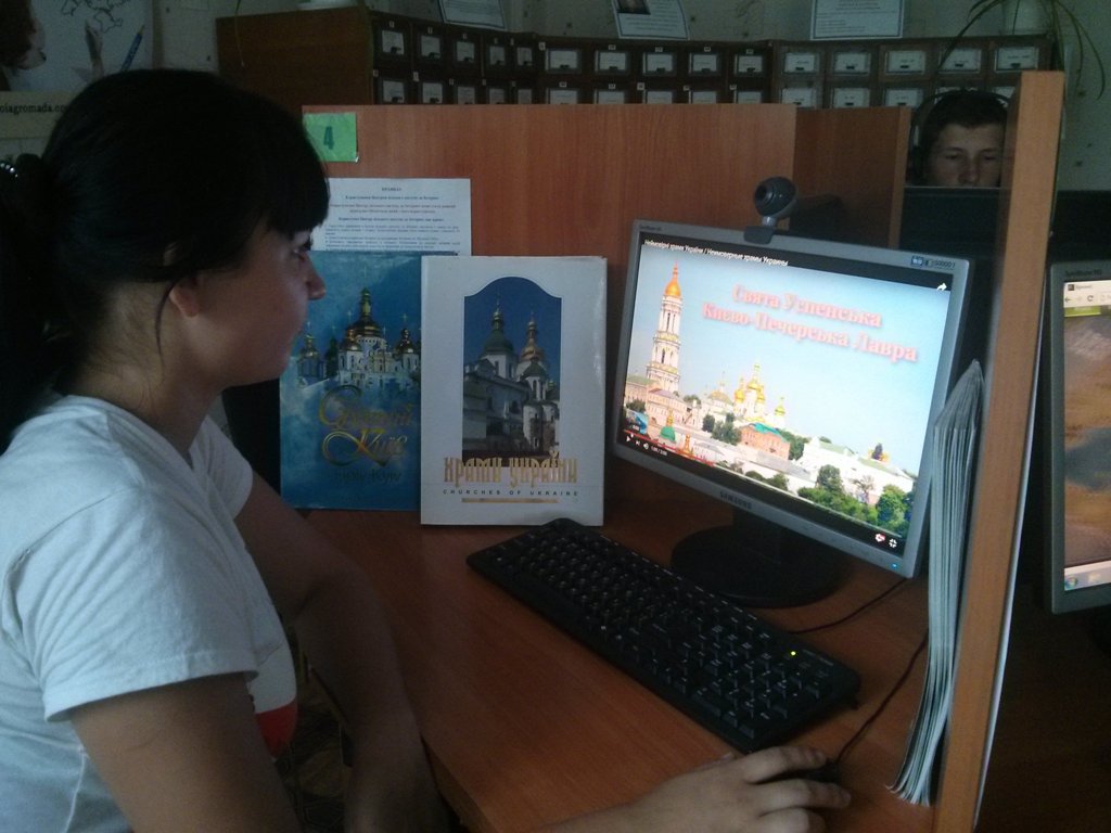В Центрі вільного доступу до Інтернет відбулась віртуально-історична подорож «Величні храми України». Користувачі з великим задоволенням відвідали перлини архітектурного мистецтва Княжої Доби: Київський собор Святої Софії, Спасо-Преображенський собор у Чернігові, Києво-Печерську лавру. Вони милувались найкрасивішими сучасними храмами Миколаївщини – це Свято-Михайлівським Пелагеївським жіночим монастирем, храмом Покрови Богородиці села Воскресенська, нещодавно відкритим Свято-Миколаївським храмом у Баштанці, церквою Іллі Пророка села Інгулка та іншими архітектурно-мистецькими храмами України.