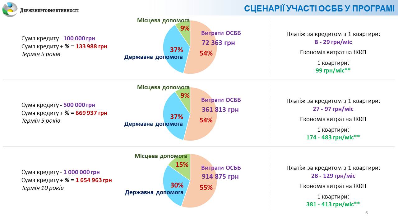 Загалом, як свідчать дані дослідження, за будь-якої суми «теплого» кредиту та за наявності місцевої допомоги ОСББ сплатить трохи більше половини кредиту. Таким чином, надання Урядового та місцевого відшкодування дозволяє значно здешевити для ОСББ вартість енергоефективних заходів.