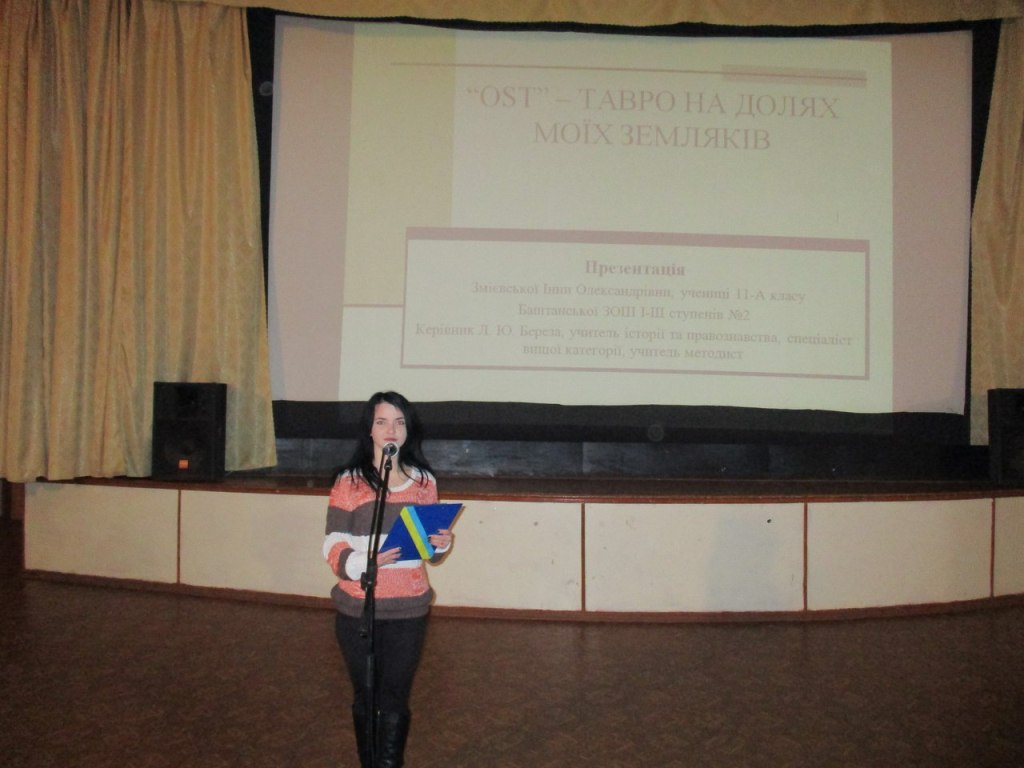 1. «ОST - тавро на долях моїх земляків» Змієвської Інни, учениці 11 класу Баштанської ЗОШ №2 (науковий гурток БДЮТ "Історія", керівник Береза Л.Ю);
