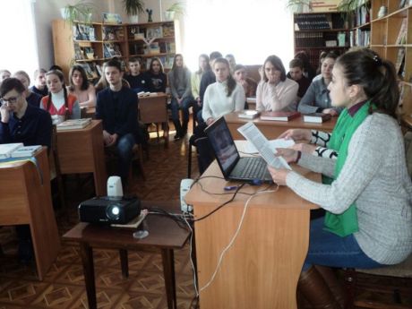 Ведучі заходу провідний бібліотекар Штефан Л.В. та бібліотекар юнацької кафедри Зікратова К.В. розповіли учням про те, як 99 років тому молоді захисники щойно посталої Української Народної Республіки власною кров’ю вписали нову героїчну сторінку в історію українського визвольного руху. Саме 29 січня 1918 року поблизу залізничної станції Крути 300 курсантів військової школи, студентів і гімназистів прийняли на полі нерівний бій із майже 6-ти тисячною більшовицькою армією, рішуче відстоюючи право українського народу жити в незалежній державі.