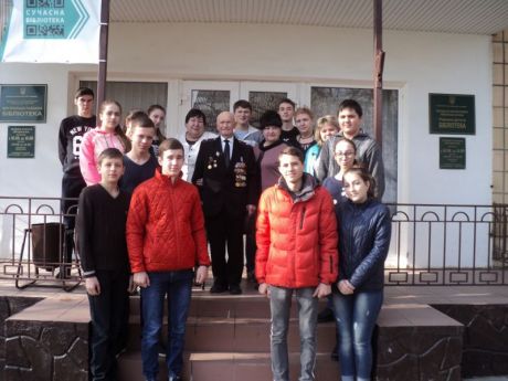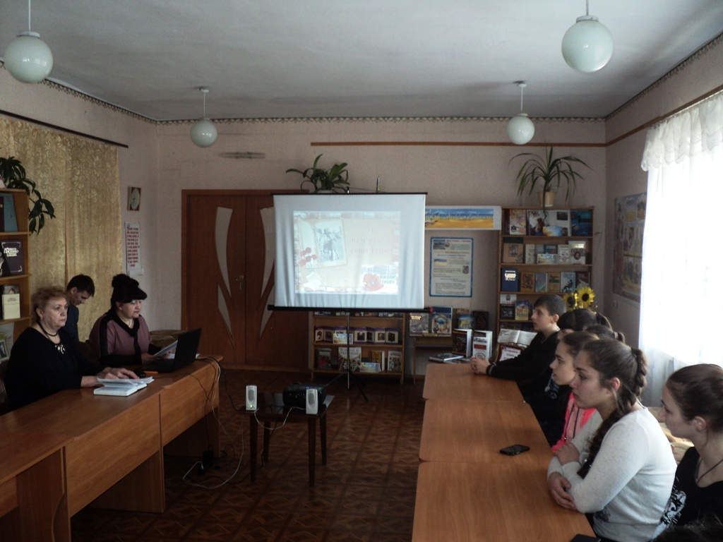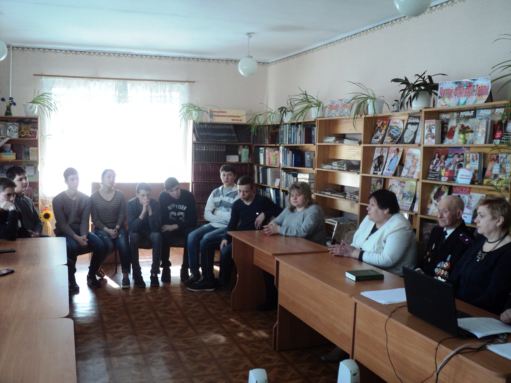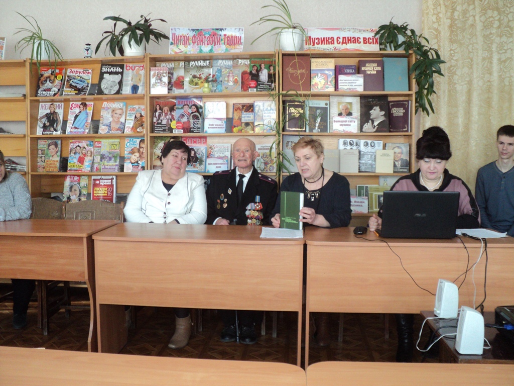 На захід до бібліотеки були запрошені: голова районної ветеранської організації Л.В.Андреєва, ветеран Другої світової війни І. А. Годових, учні 10-А класу ЗОШ №1 та вчитель історії М.В.Максимова.