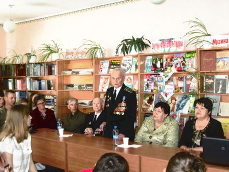 На заході лунали пісні воєнної пори у виконанні партнерів бібліотеки – працівників районної музичної школи Сушицького О.М. та Стоянової В.Г. Емоційним було звернення до молодого покоління ветерана війни Борисова П.П., який прочитав вірш В. Сергеєва «Фронтовики, наденьте ордена»  та побажав всім присутнім миру і благополуччя.