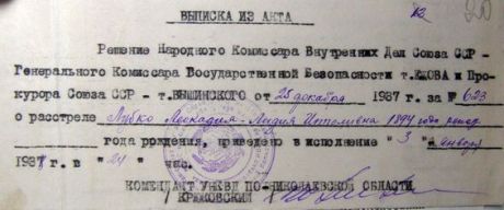 Справа №9478 медсестри Баштанської народної лікарні Леокадії (Лідії) Іполитівни ЛУБКО-ШЕВЧЕНКО, 1894 р.н., польки за національністю. З 1934 року проживала в с.Баштанка, чоловік – Марко Петрович Лубко, голова колгоспу. Леокадію Лубко-Шевченко заарештовано 26 жовтня 1937 року, перебувала під арештом у тюрмі НКВС у Миколаєві. За свідченням двох працівниць колгоспу ім. Політвідділу, вона неодноразово затівала сварку зі стахановками, обзивала і тим самим зривала їхню роботу, як передовиків виробництва. Проявляла своє невдоволення радянською владою та колгоспами. Використовувала вираз: «Скільки б ви не працювали в колгоспі, все рівно нічого не будете мати». Речові докази по справі були відсутні. Л.Лубко-Шевченко вини своєї не визнала. Рішенням Народного Комісаріату Внутрішніх Справ СРСР – Генерального Комісара Державної Безпеки тов. Єжова і Прокурора СРСР тов. Вишинського від 25 грудня 1937 року засуджена до розстрілу, який було приведено до виконання 3 січня 1938 року. У 1989 році справа Л.І.Лубко-Шевченко була переглянута і 25 грудня 1989 року її повністю реабілітовано. Родичі репресованої не були встановлені.