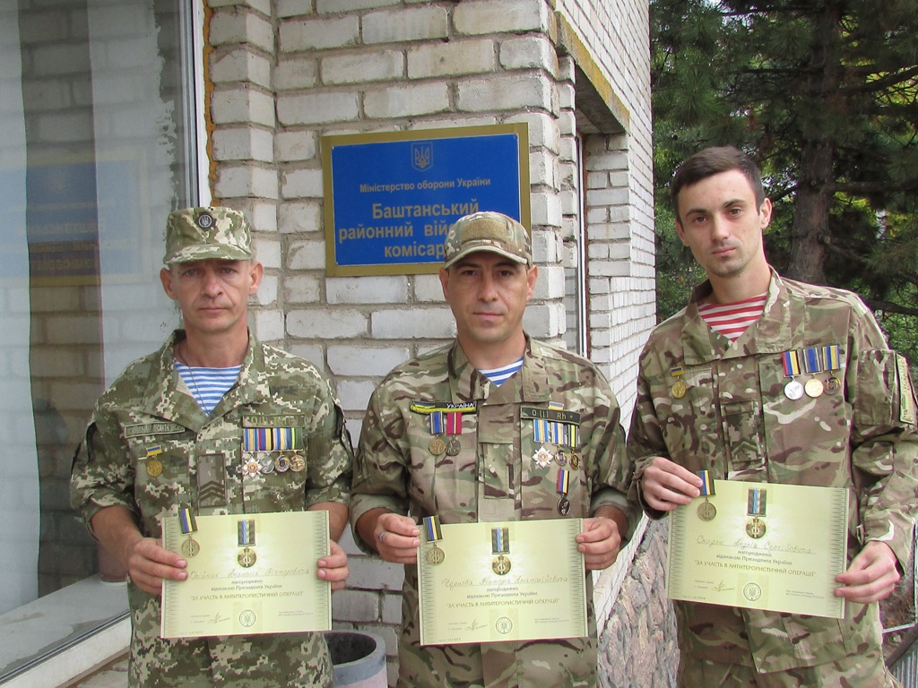 29 вересня в Баштанському райвійськкоматі військовий комісар Сергій П’ятницький у присутності голови районної ветеранської організації Лідії Андреєвої та працівників райвійськкомату нагородив відзнакою Президента України “За участь в антитерористичній операції” сімох військовослужбовців Баштанського району – Андрія СКИДАНА, Віктора ЧЕРНОВА, Анатолія ОЛІЙНИКА, Петра БЕЛЬЗЕЦЬКОГО, Олександра РОСТАВЕЦЬКОГО, Володимира ЛАНЦОВА, Сергія АНГЕЛОВА.