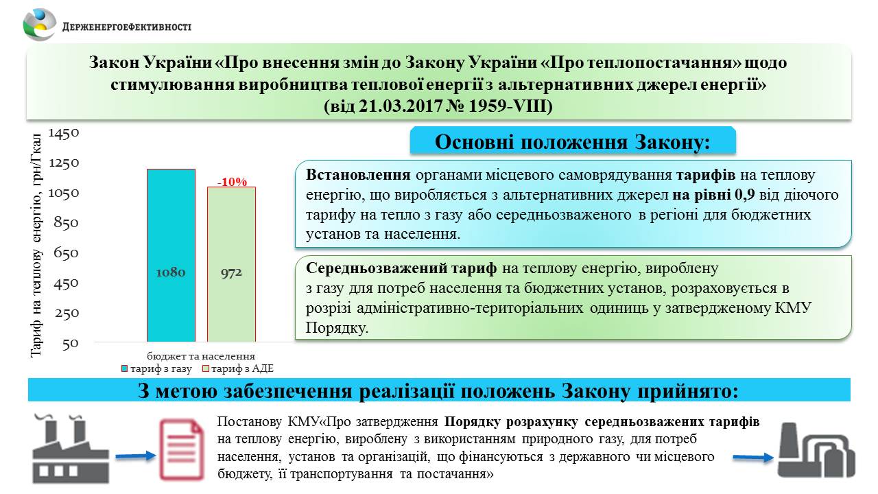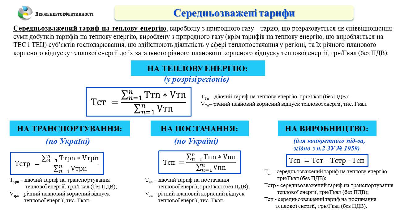 Довідково: Відповідно до Закону України від 21.03.2017 №1959-VIII зазначені середньозважені тарифи щоквартально, до 25 числа останнього місяця кварталу, розраховуються Держенергоефективності за інформацією НКРЕКП та органів місцевого самоврядування у порядку, затвердженому Урядом.