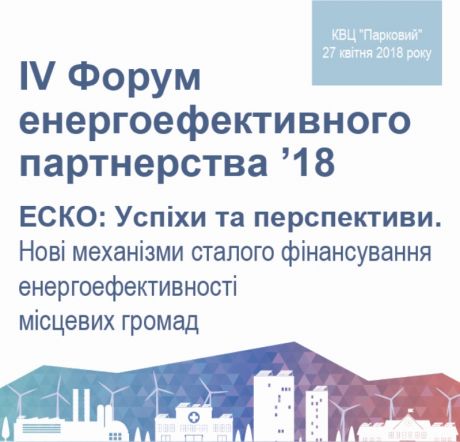 27 квітня 2018 р. у м.Києві у КВЦ «Парковий» Держенергоефективності організовує головну подію року у сфері енергоефективності – IV Форум енергоефективного партнерства’18 «ЕСКО: Успіхи та перспективи. Нові механізми сталого фінансування енергоефективності місцевих громад».