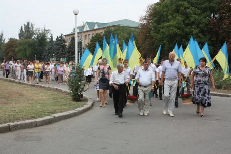 Участь у святковій ході та мітингу на чолі з головою РДА Іваном Рубським та головою районної ради Людмилою Луценко взяли громадськість міста, представники установ, громадських організацій, підприємці, школярі, які під жовто-блакитними знаменами святковою колоною прийшли до пам'ятника Тарасу Шевченку, біля якого встановлено Державний прапор України.