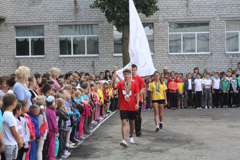 На початку урочистостей на шкільне подвір’я найкращі спортсмени школи – призери Всеукраїнських змагань «Старти надій», «Козацький гарт», «Сокіл», «Джура» - Ричкова Юлія, Степанова Анастасія, Бондаренко Володимир та Іваніцький Володимир винесли олімпійські факел та прапор.