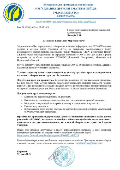 На адресу райдержадміністрації надійшов лист від Об'єднання дружин і матерів бійців учасників АТО (Об'єднання дружин і матерів бійців учасників АТО) з пропозицією співпраці.