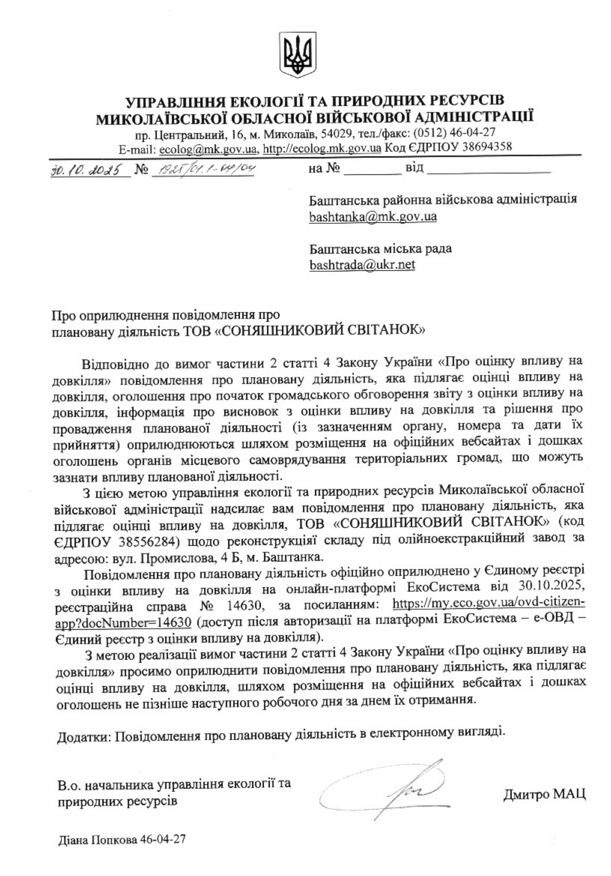 Повідомляємо про початок громадського обговорення звіту з оцінки впливу на довкілля планованої діяльності, зазначеної у пункті 1 цього оголошення, з метою виявлення, збирання та врахування зауважень і пропозицій громадськості до планованої діяльності.