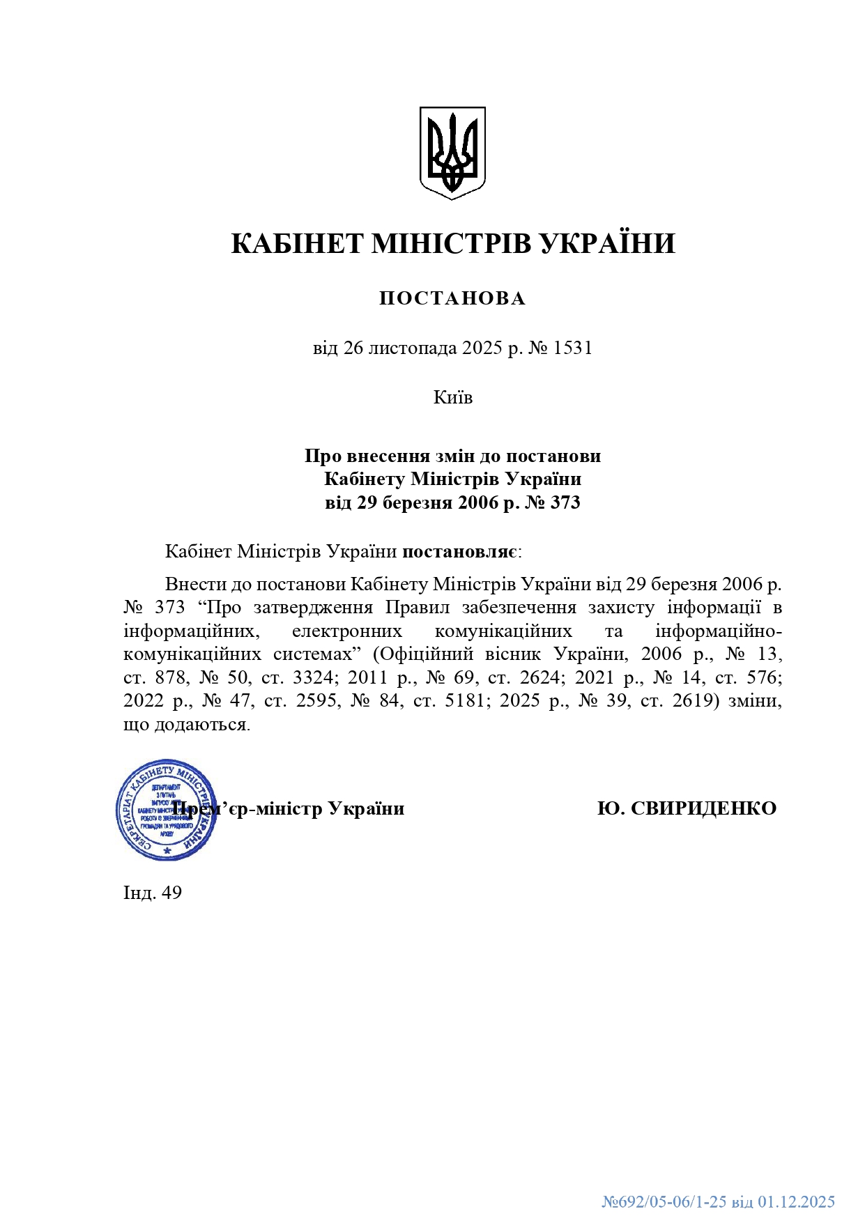 Кабінетом Міністрів України затверджено постанову від 26 листопада 2025 року № 1531 "Про внесення змін до постанови Кабінету Міністрів України від 29 березня 2006 р. № 373”.