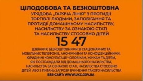 В Україні за телефонним номером 1547 цілодобово та безкоштовно діє Гаряча лінія з протидії торгівлі людьми, запобігання та протидії домашньому насильству, насильству за ознакою статі та насильству стосовно дітей.