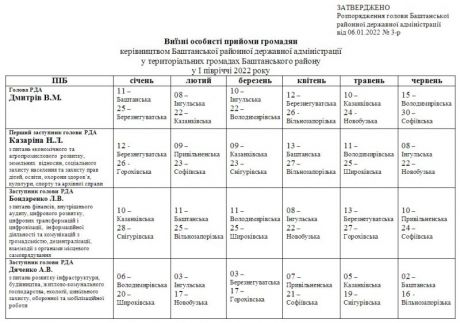 Оновлено розділ «Графік проведення виїзного прийому громадян головою та заступниками голови райдержадміністрації у 2022 році», детальніше за посиланням: bashtanka.mk.gov.ua/ua/rda/authority/1532674053/