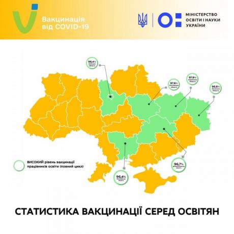 Кращі показники щеплених двома дозами по областях: Харківська – 97,9%; Полтавська – 97,6%; Дніпропетровська – 96,7%; Луганська – 96,6%; Миколаївська – 96,4%; Київська – 96,4%. Відсоток вакцинованих повним циклом працівників у закладах освіти виглядає так: спеціалізованої освіти – 97,1%; професійної – 96,7%; загальної середньої – 94,6%; дошкільної – 92,4%; фахової передвищої – 89,5% та - вищої – 87,1%, - написав він.